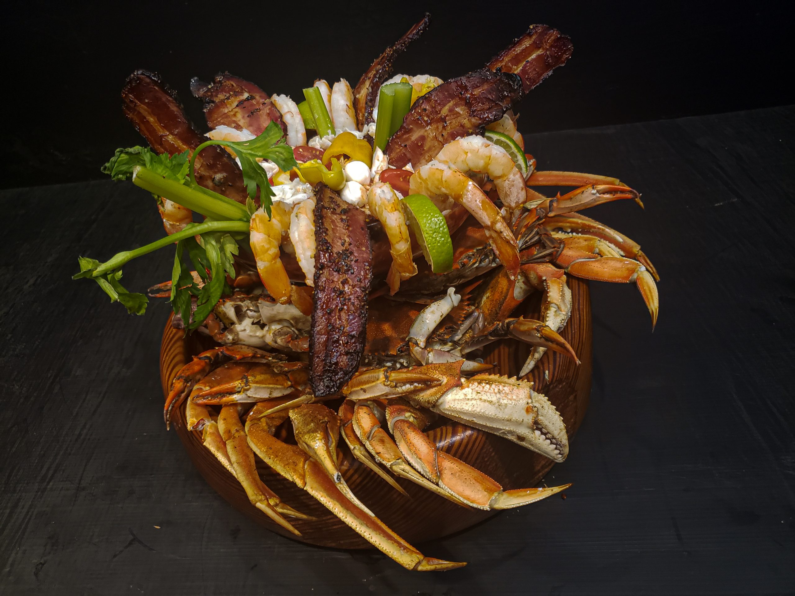 This is a Seafood Jack Daniels Bloody Mary – presenting a centerpiece giant margarita glass containing split shelled grilled lobster tails, lump crab, grape tomatoes, sliced sweet pepper rings, fresh mozzarella balls, celery, candied and peppered crisped bacon, lime wedges, and jumbo shrimp – all bathed in a Tabasco spicy horse radish bloody mary mix with Jack Daniels. Standing in a bedding of old bay and beer steamed blue claw crabs, and snow crab legs. Shown displayed in a hand turned Douglass Fir bowl by Artisans of the Valley.